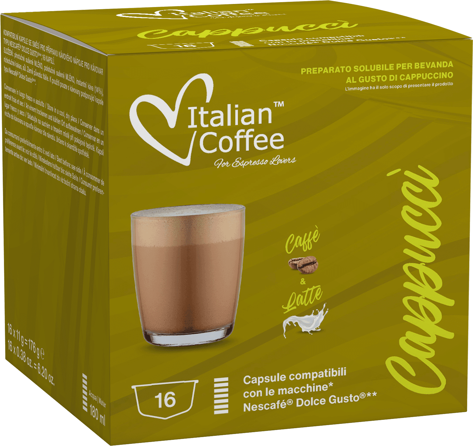 Co to jest cappuccino? To połączenie wyśmienitej kawy i spienionego mleka. Kto choć raz miał możliwość wypicia tego wyjątkowego naparu, ten na pewno będzie szukał tego smaku po raz kolejny. W kapsułkach kompatybilnych z systemem Dolce Gusto® znajdują się wyselekcjonowane ziarna kawy. Oferowane przez nas cappuccino nie zawiera cukru. W kapsułkach kompatybilnych z systemem Dolce Gusto® znajdują się tylko i wyłącznie naturalne składniki. Z jednego opakowania przygotujesz aż 16 filiżanek cappuccino.