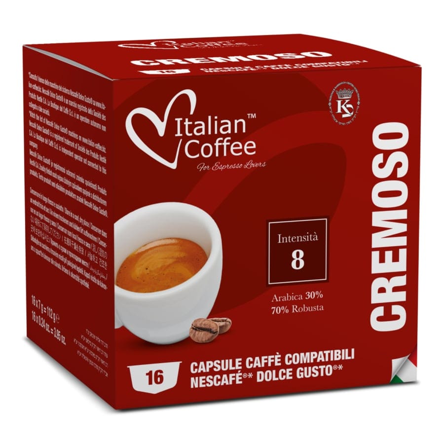 Kapsułki Dolce Gusto Cremoso oferują niepowtarzalne połączenie smaków, o którym nie zapomnisz przez długi czas. Kawa charakteryzuje się orzeźwiającym i słodkim aromatem. Dominują w nim orzechowe nuty. Cremoso, jak sama nazwa wskazuje, ma wyjątkowo kremową konsystencję. Dzięki kapsułkom Dolce Gusto w bardzo szybkim tempie możesz delektować się smakiem tej niezwykłej kawy, w której dominuje posmak niesłodzonego kakao. W kapsułkach Dolce Gusto znajduje się mieszanka wyselekcjonowanych ziaren kawy. Cremoso to kawa idealna zarówno do espresso jak i do różnych wariantów mlecznych kawy.